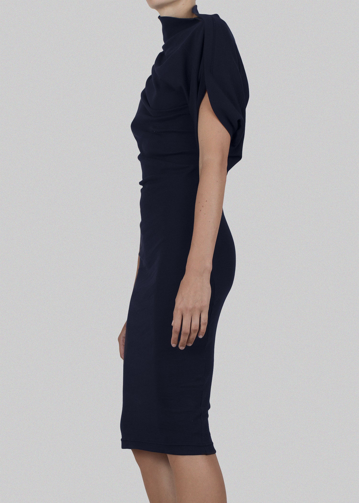 Asymmetrical dress in soft cotton rib. Drape detail extends from neck to form a softly draped sleeve. Natural stretch of the rib creates a soft but slim fit.