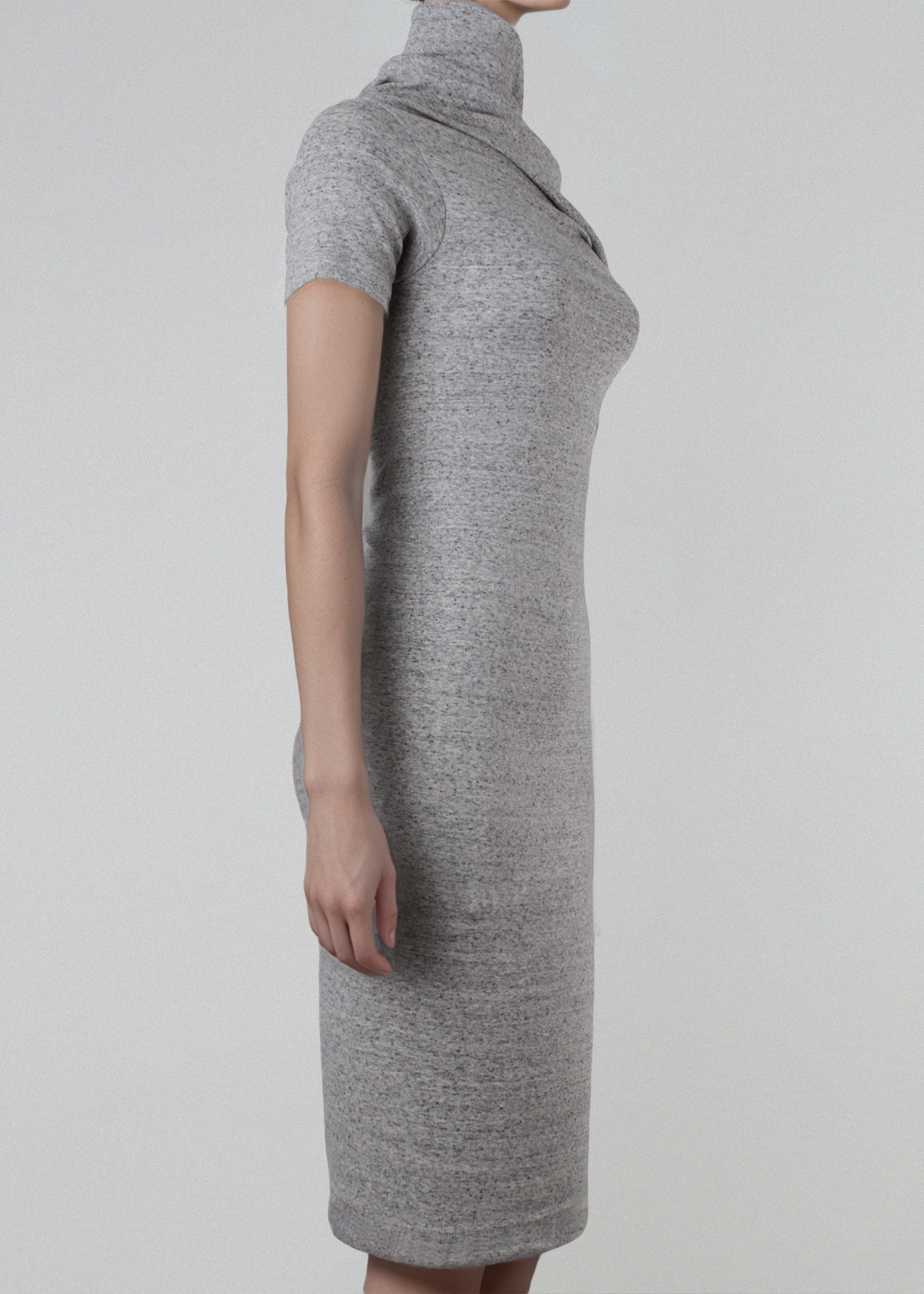 Asymmetrical dress in soft cotton rib. Drape detail extends from neck to form a softly draped sleeve. Natural stretch of the rib creates a soft but slim fit.