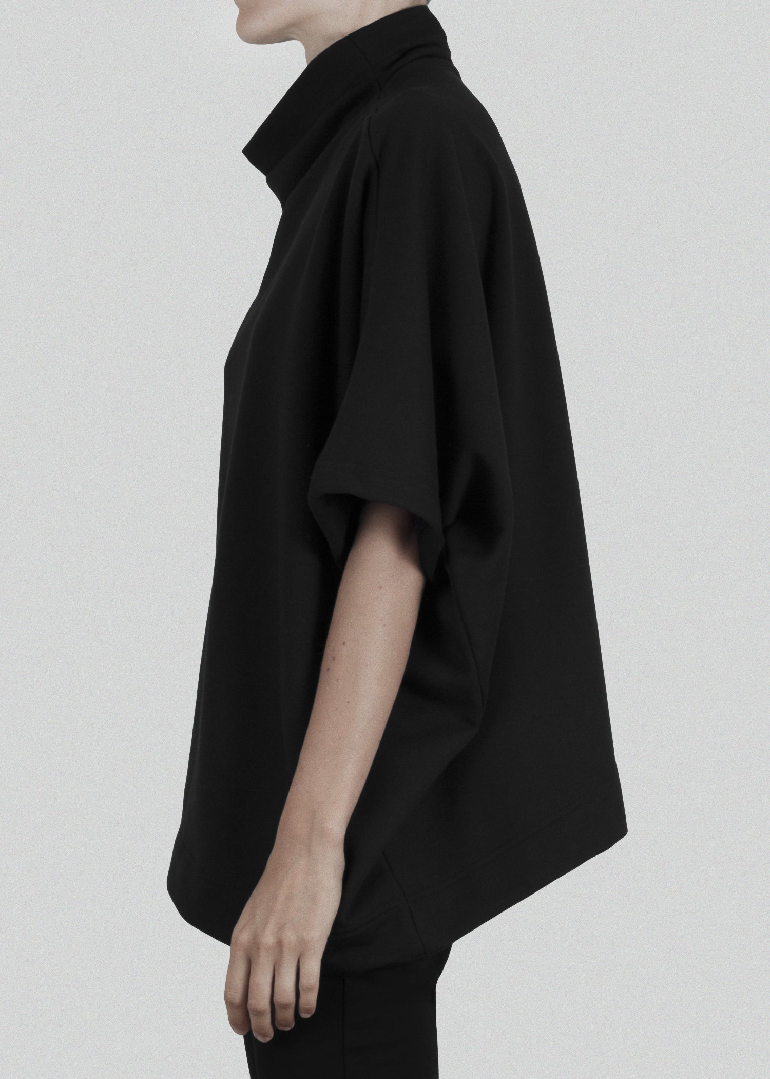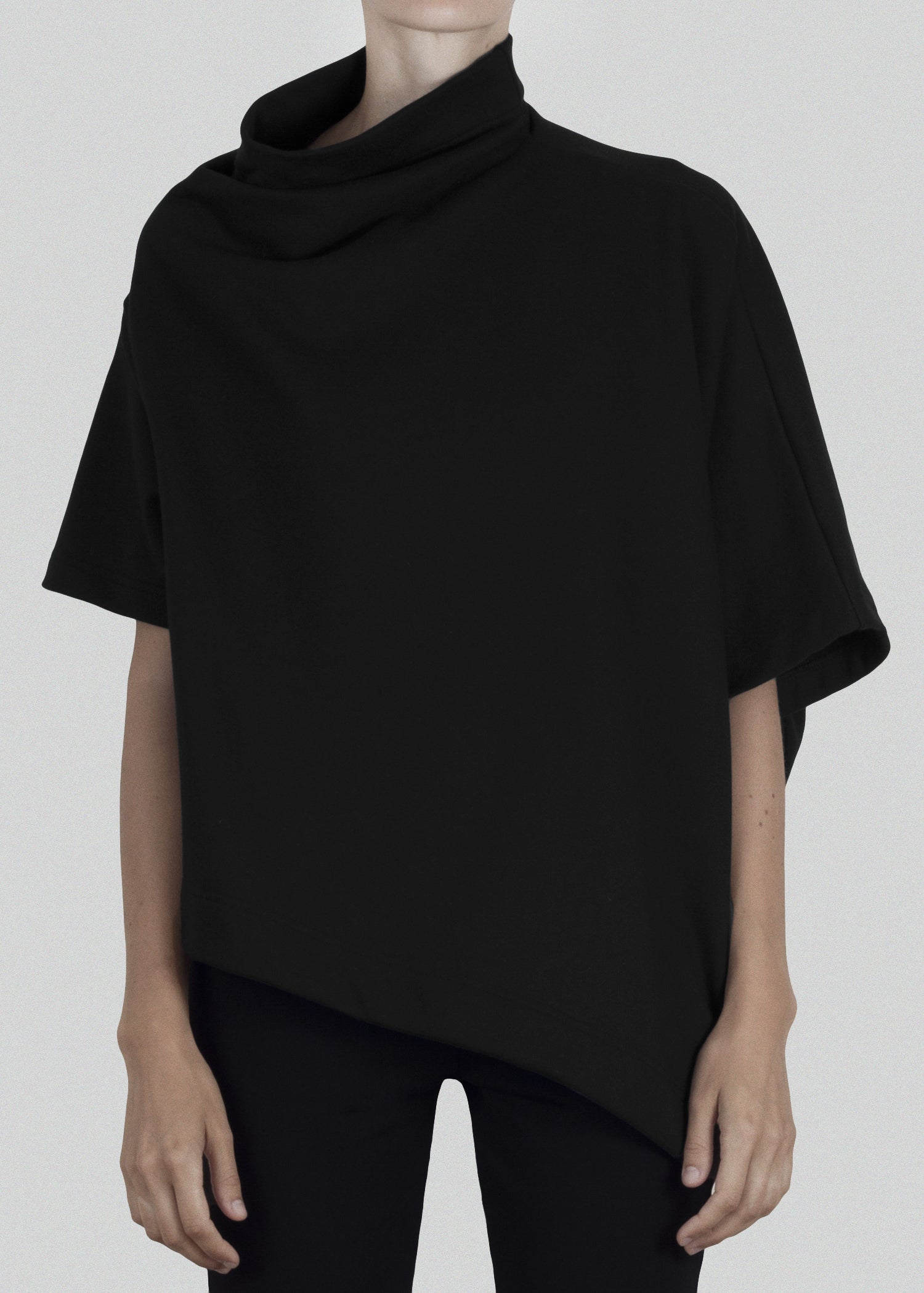 Asymmetrical cotton sweatshirt. Generous cut drapes under one arm. High draped neck.