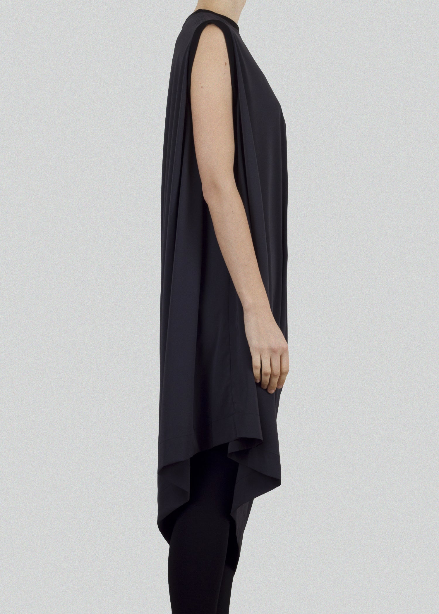 Asymmetrical tank dress in lightweight technical fabric. Ribbed collar and armholes. Unisex.