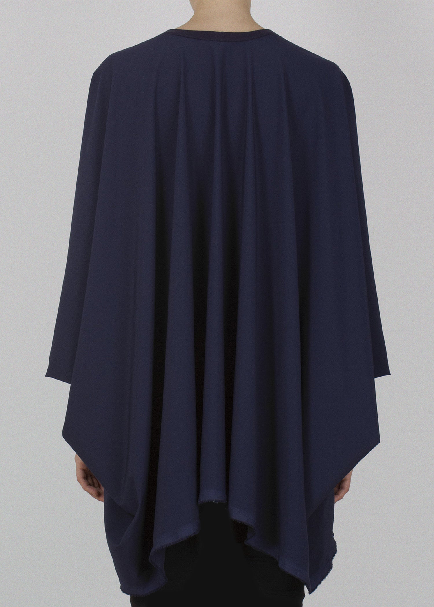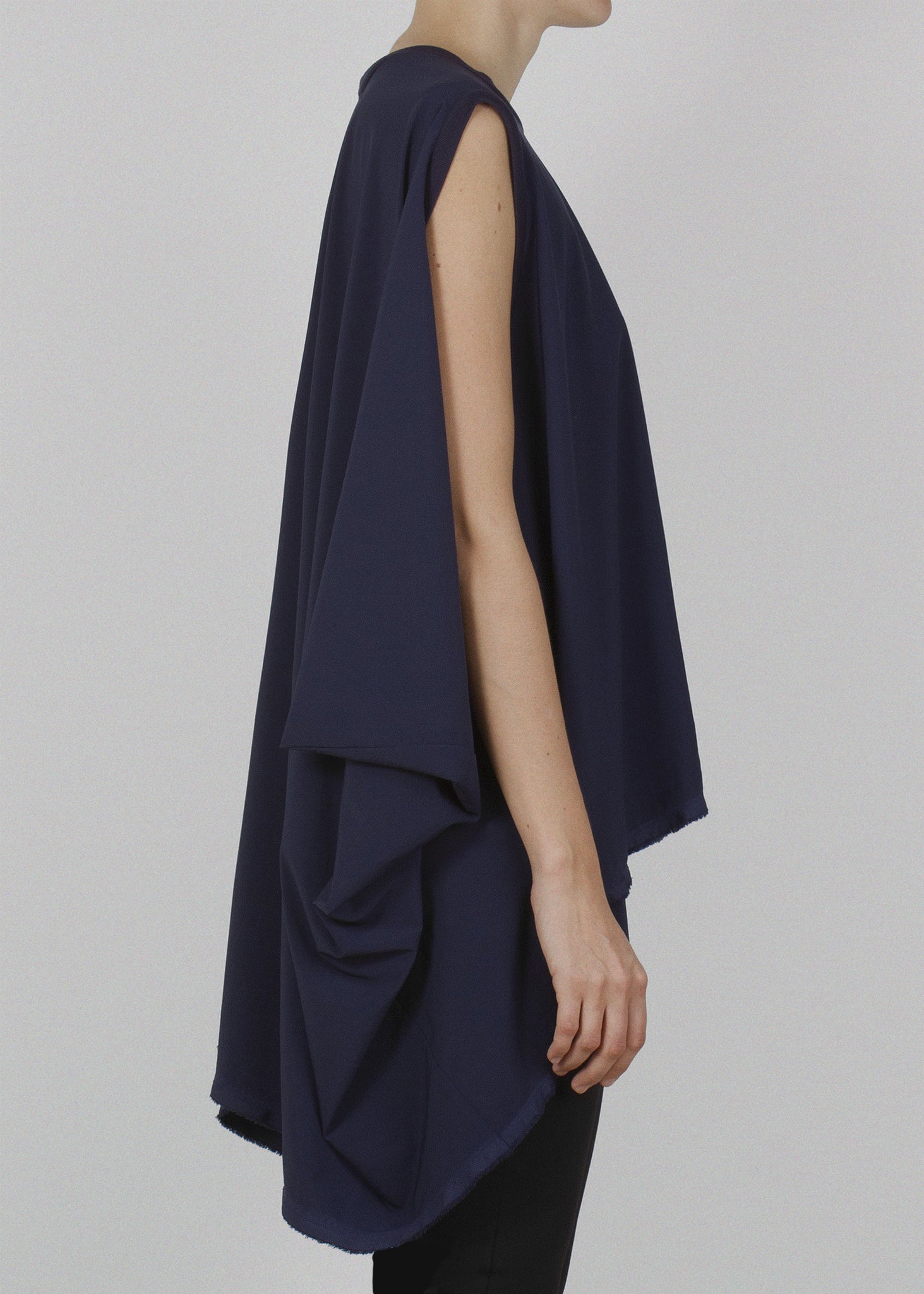Draped sleeveless tank made from lightweight technical fabric. Rectangular cut creates dramatic movement and cape-like draping. Ribbed collar and armholes. Selvedge hem. Unisex.