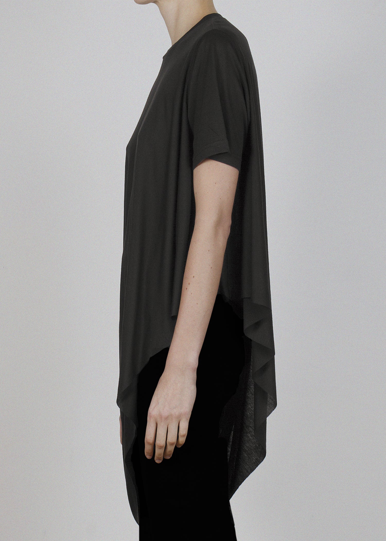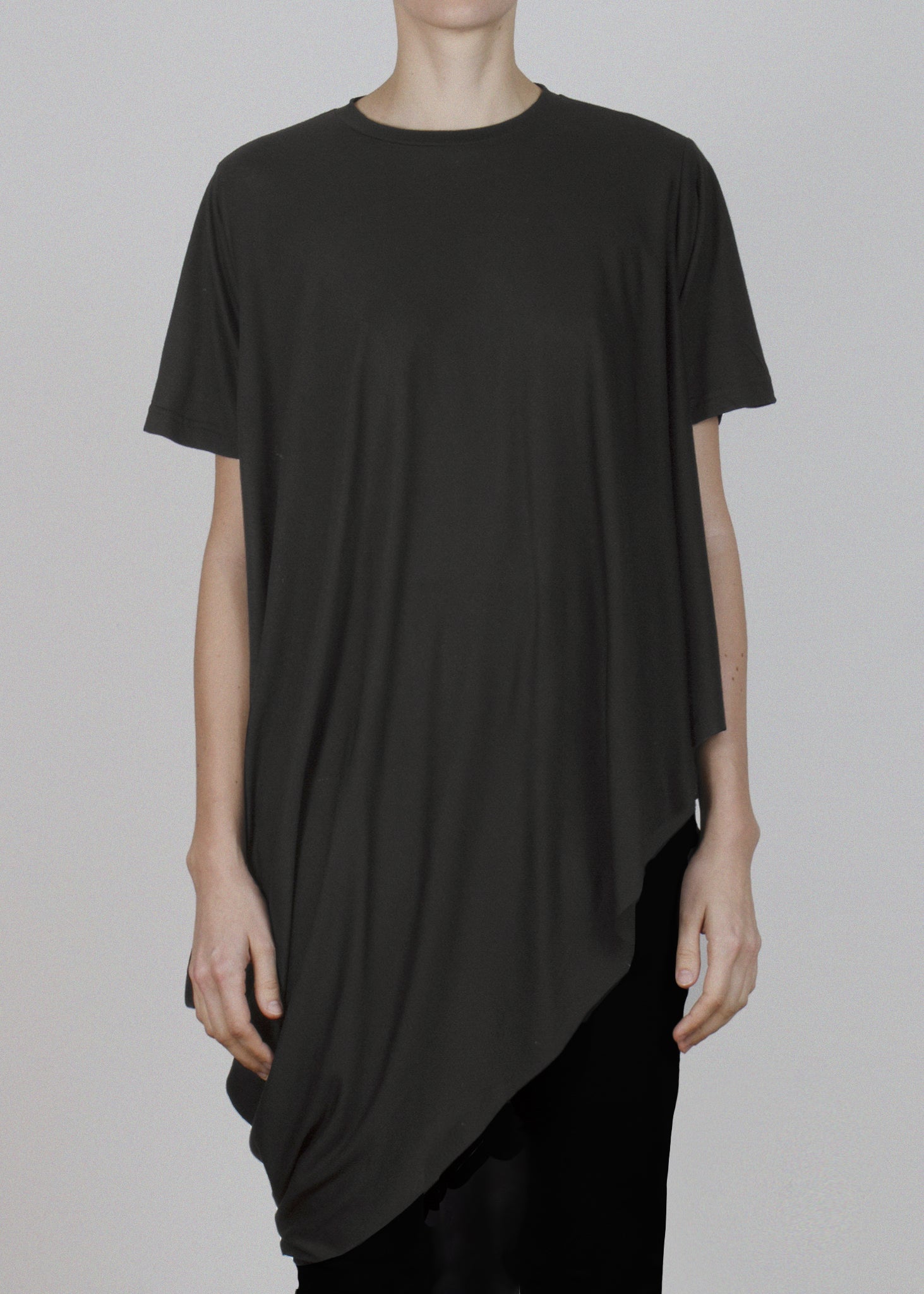 Asymmetrical draped short sleeve t-shirt with soft round crew neck collar. Raw edge finish at hem.