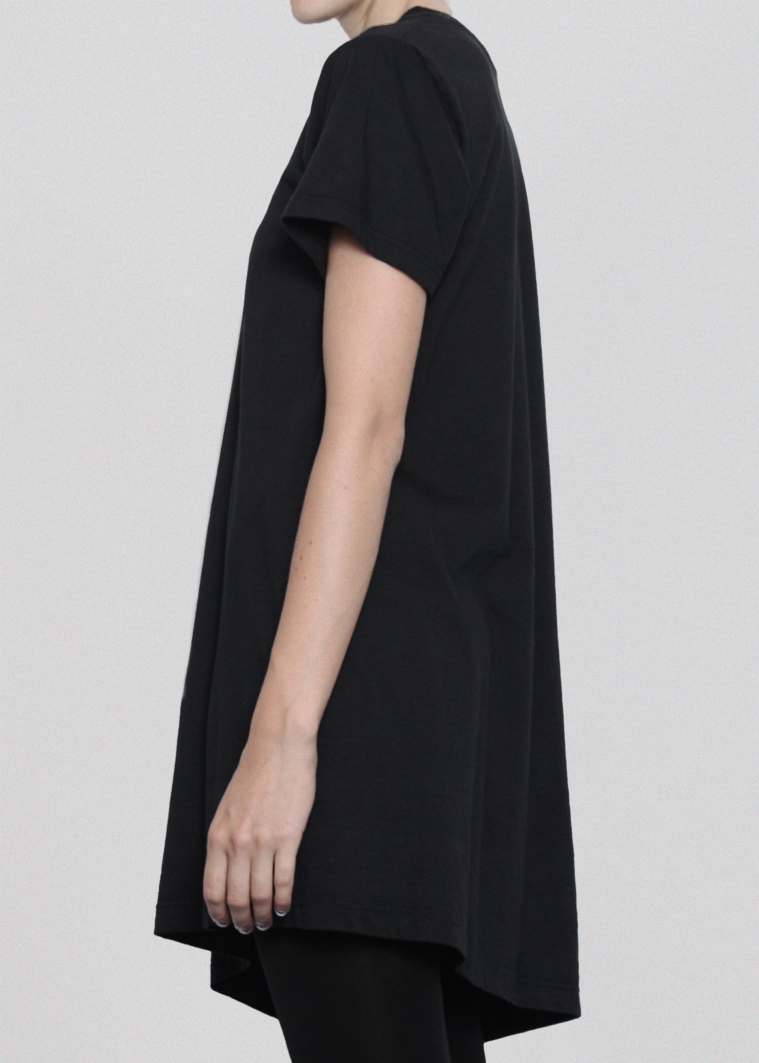 Soft cotton unisex tshirt with soft draping under right arm. Crew neck. Asymmetric hem, slightly longer on one side.