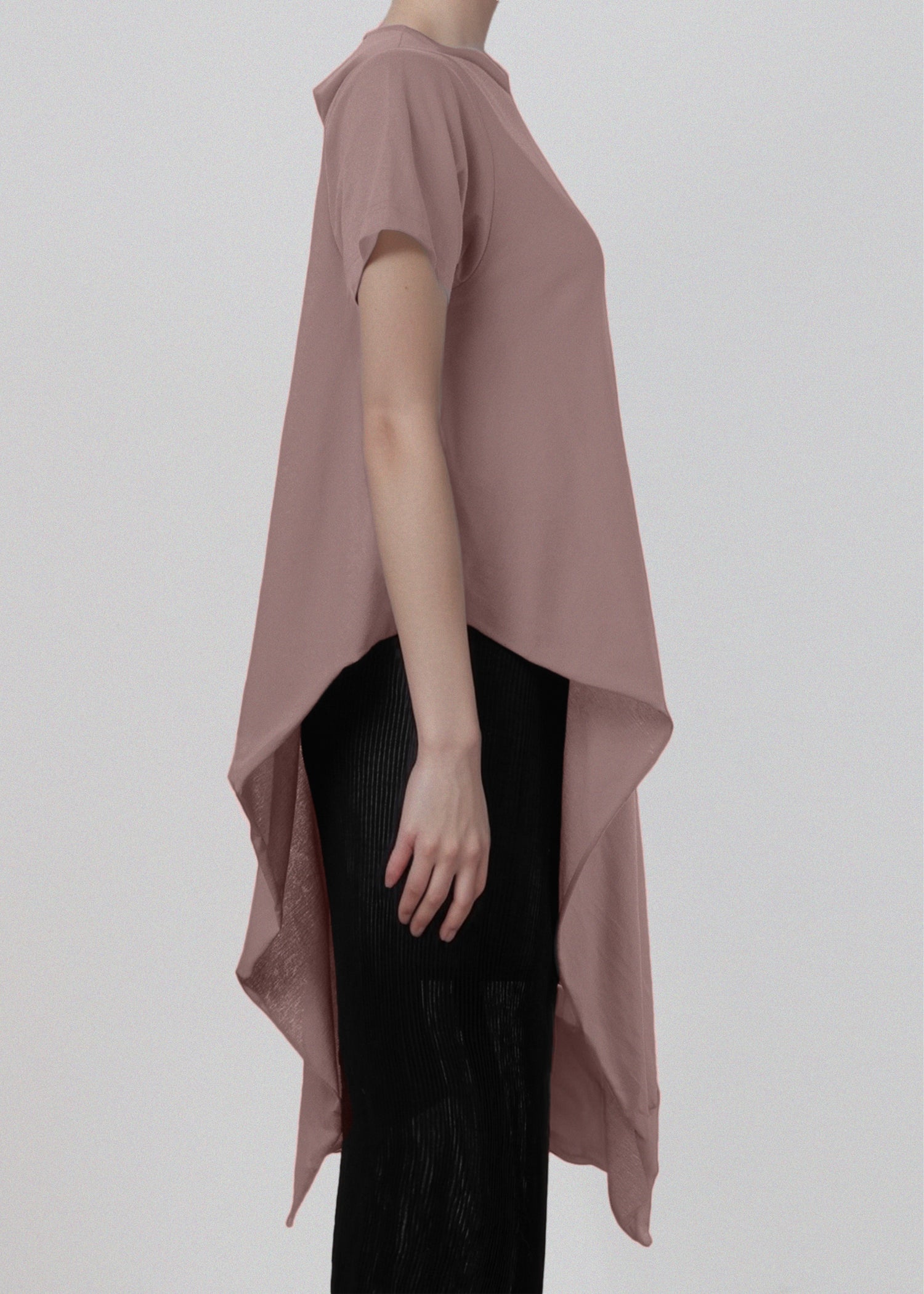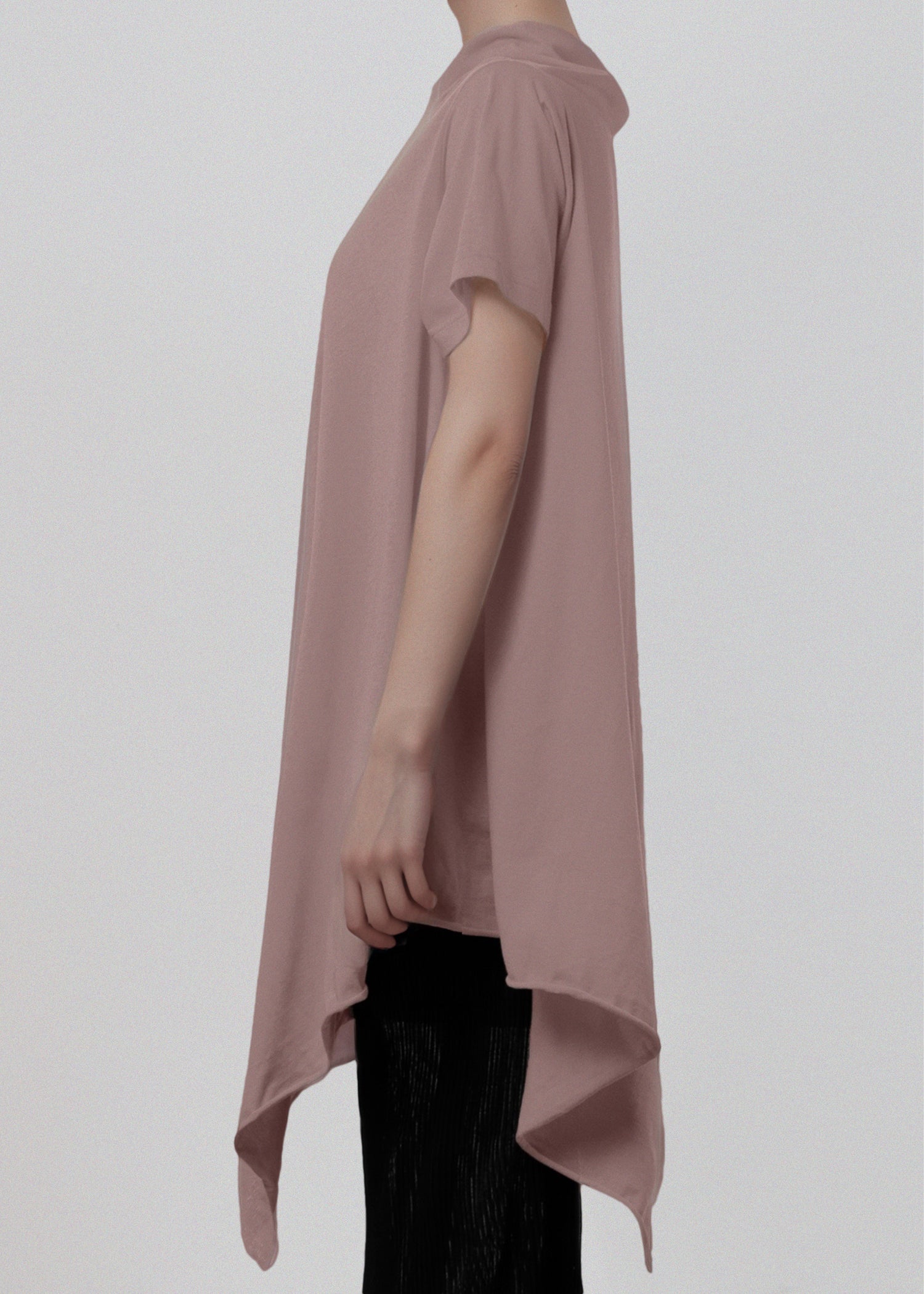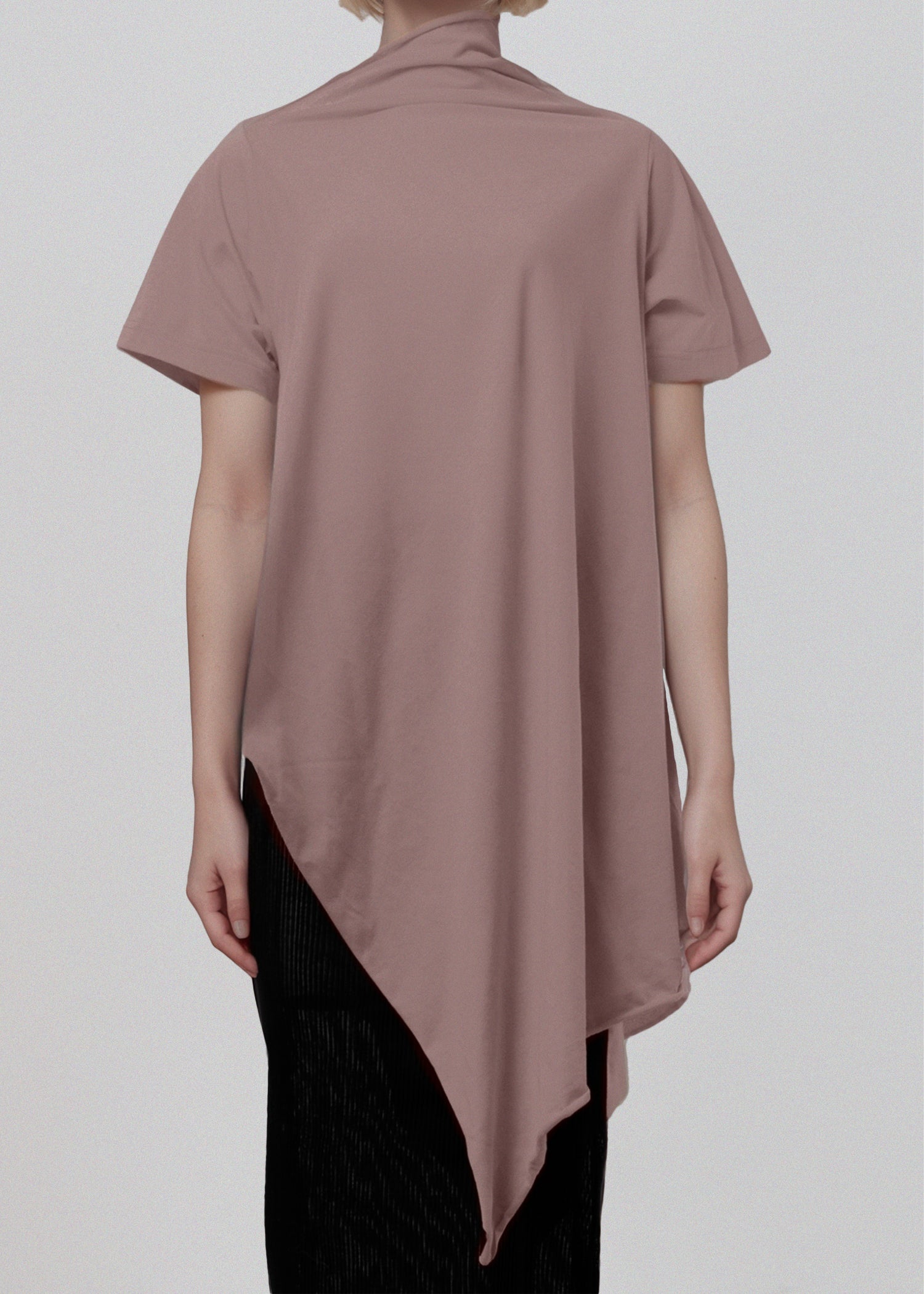 Asymmetrical t shirt in soft cotton jersey. Dramatic draping hangs longer on one side. Raw hem and draped asymmetrical collar.