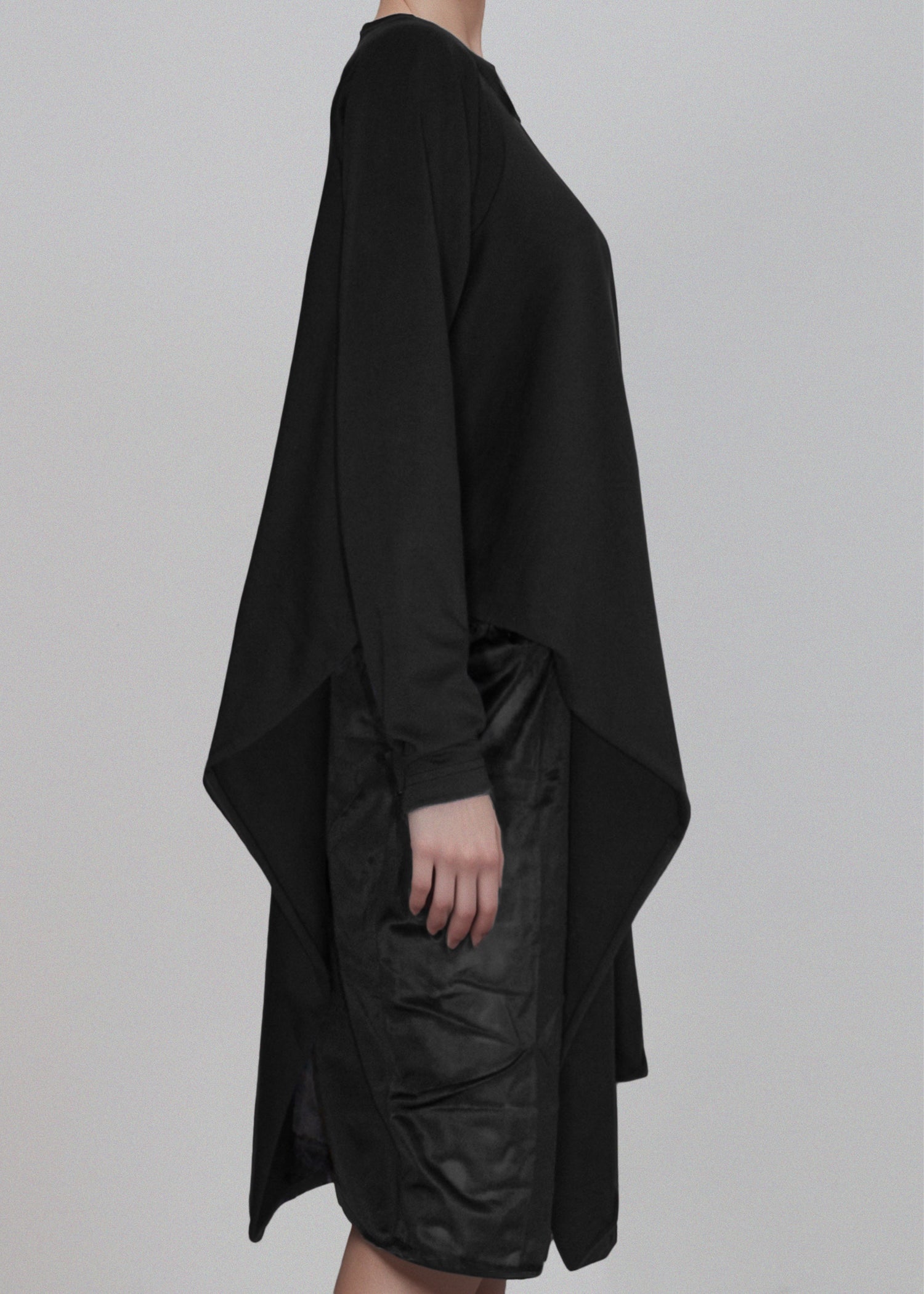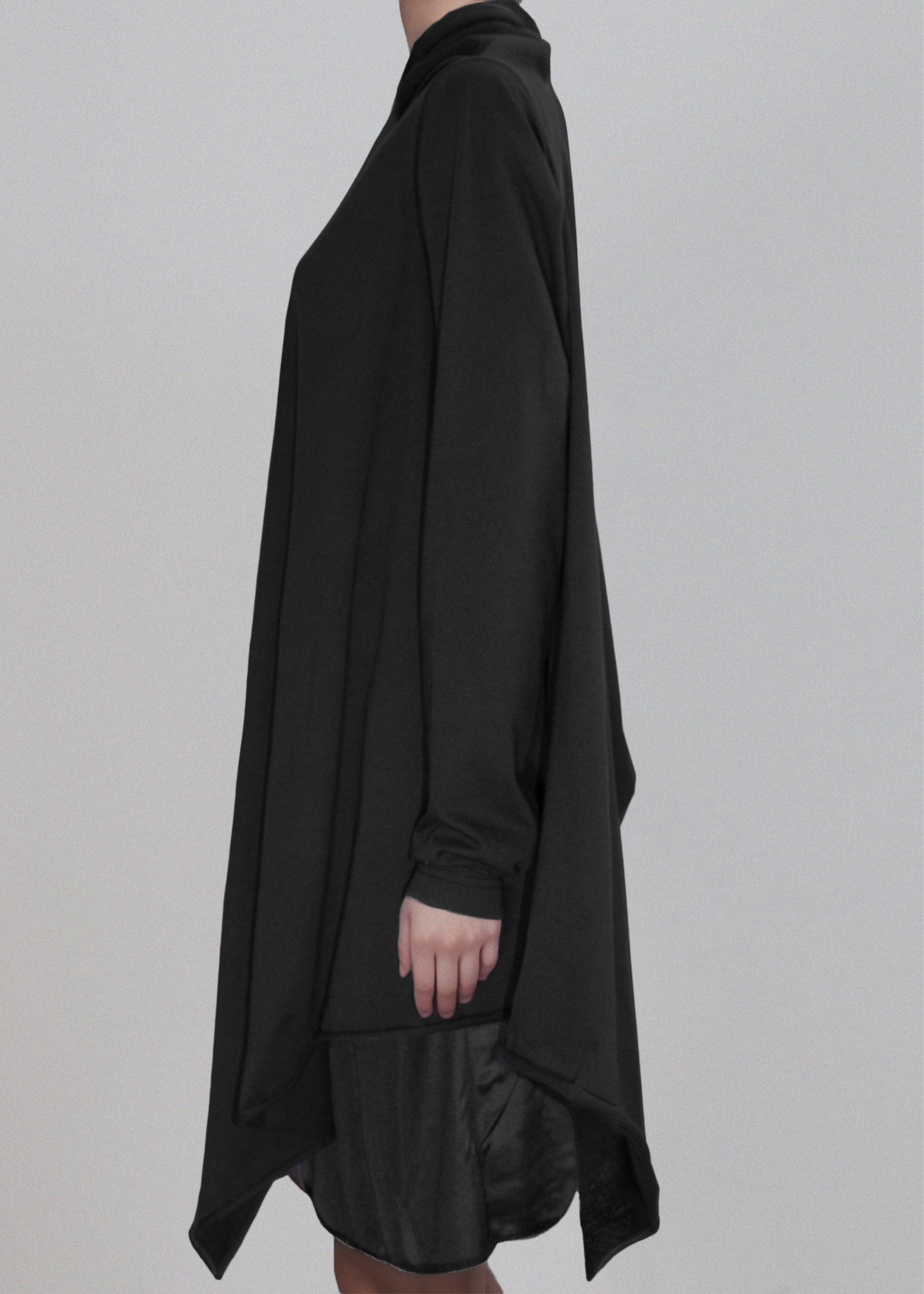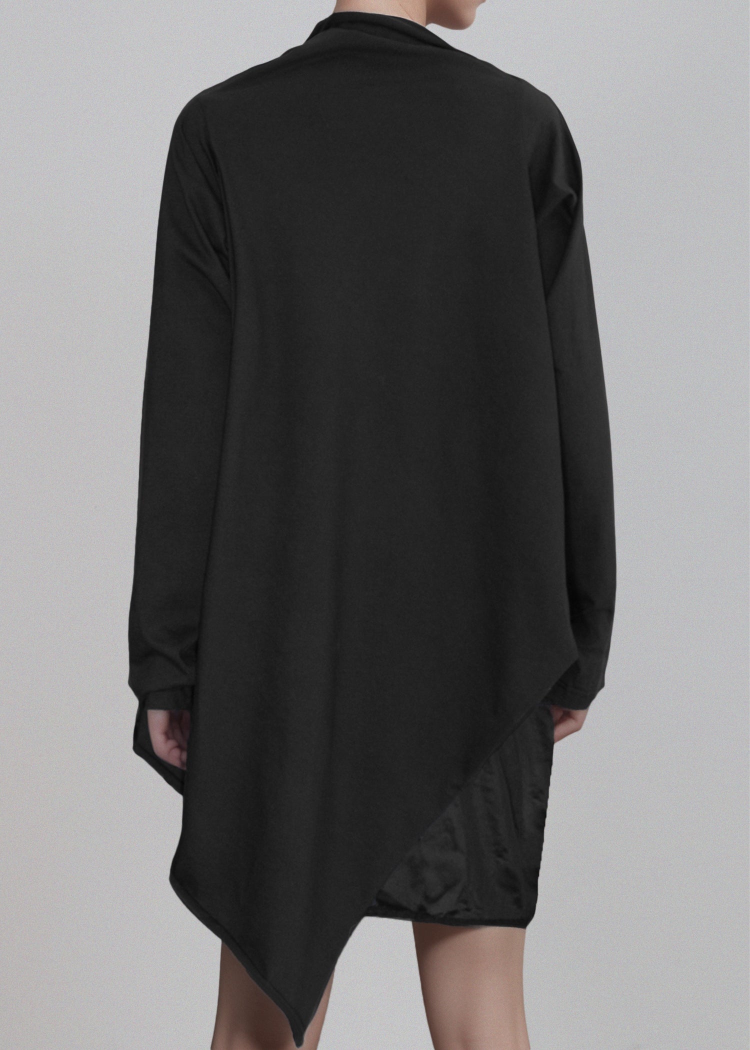 Asymmetrical long sleeve t shirt in soft cotton jersey. Dramatic draping hangs longer on one side. Raw hem and draped asymmetrical collar.